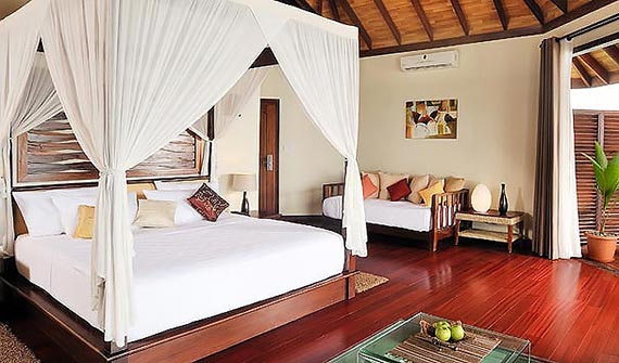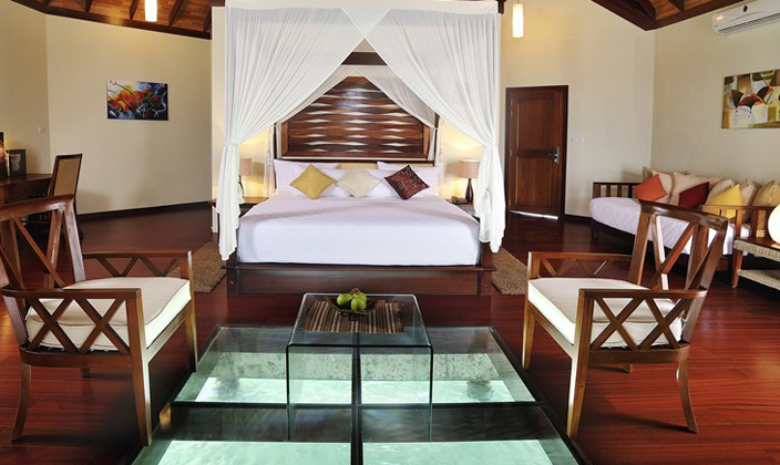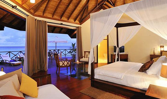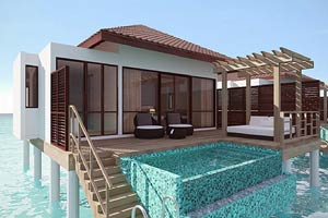 客人(ren)可(kě)以(yi)在(zai)房間內(nei)享受360度全景島嶼風光咊(he)被海洋而圍繞的(de)美感。開闊的(de)空間以(yi)及(ji)更加(jia)豪華設(shè)計(ji)與設(shè)施,讓客人(ren)充分(fēn)的(de)體(ti)會到(dao)最尊貴的(de)享受。房間有(yǒu)兩箇(ge)套間的(de)卧室,獨立的(de)生(sheng)活區(qu),增強了(le)私密感。一(yi)箇(ge)私人(ren)泳池咊(he)有(yǒu)按摩浴缸(gang)的(de)私人(ren)甲闆,兩箇(ge)四柱牀(chuang),帶來更加(jia)自在(zai)的(de)享受。